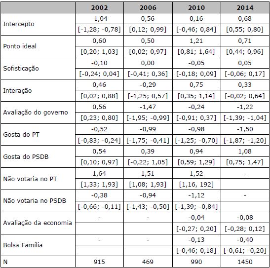 Para eleitores indiferentes (xi=0), as conclusões são semelhantes. Para as eleições de 2010, se o eleitor for muito sofisticado, a probabilidade de ele votar no candidato do PSDB é de 41,3%. Se ele possuir um nível médio, a probabilidade é de 39,8%. E se ele for pouco sofisticado, a probabilidade é de 38,2%. Ou seja, para todos os níveis de sofisticação, a candidata do PT possuía uma vantagem baseada em um componente não espacial. Essa vantagem era maior quanto menor a sofisticação do eleitor. Mas, novamente, não podemos afirmar que eleitores menos informados votariam por critérios não espaciais e eleitores sofisticados votariam por critérios ideológicos, ambos os tipos de eleitores levam em consideração a distância relativa dos candidatos e isso vale para os outros pleitos. Em 2002, eleitores com um nível de sofisticação baixo, médio e alto tinham 32,3%, 29,2% e 26,3% de chances de votar no candidato do PSDB, respectivamente. Em 2006, as probabilidades foram de 30,4% (baixo), 30,6% (médio) e 30,7% (alto). Por fim, em 2014 o cenário foi muito semelhante, 45,6% (baixo), 46,6% (médio) e 48,4% (alto).