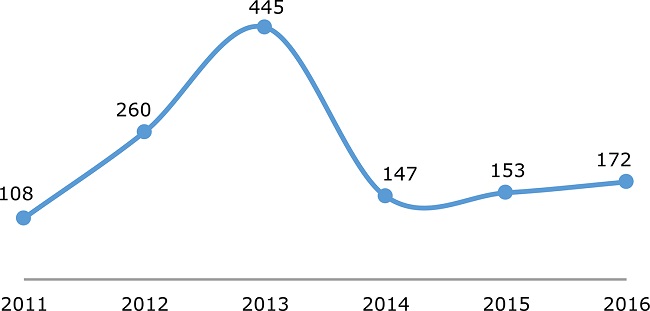 Como se pode observar no Gráfico 1, os protestos seguiram uma trajetória oscilante. O ano de 2012 apresenta uma curva ascendente, registrando um aumento de 140% em relação a 2011 e um comportamento acima da média, o que sugere que o caldeirão de insatisfações que explode em 2013 já estava aquecendo desde o ano anterior. Em 2013 os protestos alcançam o dobro da média do período, constituindo o ponto mais alto da curva. Esse período de intensa mobilização, precipitado pela reivindicação da redução da tarifa dos transportes públicos, ficou conhecido como Jornadas de Junho14. Após um declínio em 2014, possivelmente em função do processo eleitoral, os protestos ganharam novo fôlego no âmbito da campanha pelo impeachment de Rousseff, a partir de 2015, mas o crescimento observado não retoma o patamar de 2013. A variação anual é mais tímida e inferior à média do período, com 153 protestos em 2015 e 172 em 201615. Apesar disso, estamos considerando que 2015-2016 representa um novo pico de mobilização em virtude da difusão territorial dos protestos e do número de participantes neles envolvido16.