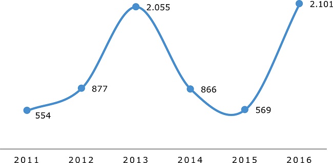 A operacionalização do conceito tem como principal desafio definir se o que a notícia reporta é um evento ou se são eventos múltiplos, o que significa estabelecer fronteiras temporais e espaciais (Olsak, 1989). Para que o evento seja definido como um evento, todas as seguintes características devem estar presentes: ter a mesma data de início, não haver interrupção, responder à mesma “convocação” e sustentar a mesma reivindicação/queixa, mesmo que com diferentes ações e/ou ocorrendo em diferentes localidades. Por exemplo, a manifestação pelo impeachment convocada pelo Movimento Brasil Livre (MBL) em 15/3/2015 ocorreu em dezenas de cidades, o que nos levou a considerá-la um evento único. A estrutura do nosso banco nos permite coletar a informação para cada cidade mencionada na reportagem, mas todas elas receberam um mesmo código de evento. Isso nos permite trabalhar a informação agregada por evento ou desagregada por cidade. Para o período entre 1/1/2011 e 31/08/2016, nosso banco possui 1.285 registros agregados por evento, 2.072 desagregados por cidade e 2.548 notícias de protestos (um mesmo evento de protesto pode ser objeto de várias reportagens, o que é comum em campanhas longas, como a ocupação de uma escola ou uma greve, por exemplo). Neste artigo utilizamos a informação agregada por evento, à exceção do Gráfico 2, onde comparamos por evento e por cidade.