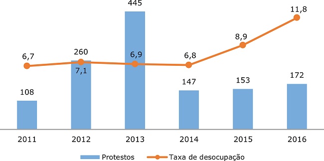 Ou seja, os protestos crescem tanto num ano marcado por modesto crescimento econômico e baixo desemprego (2013) quanto naqueles marcados por recessão e desemprego elevado (2015-2016).