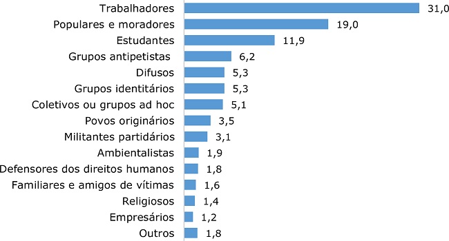 Como vemos no Gráfico 7, os grupos sociais tradicionalmente mobilizados são os que mais se fizeram presentes nas ruas entre 2011 e 2016, a exemplo dos trabalhadores (31%), o que indica que o conflito entre capital e trabalho continua ativo na geração dos protestos. Em seguida está a categoria populares e moradores (19%), que abarca grupos vinculados a associações de moradores, organizações de sem-terra e sem-teto (como o Movimento dos Trabalhadores Sem Terra, MST, e o Movimento dos Trabalhadores Sem Teto, MTST), movimentos comunitários por melhoria nos serviços públicos e frentes que articulam diferentes movimentos.