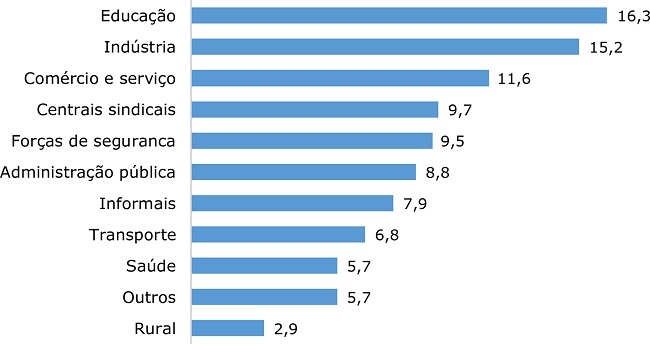 Conforme o Gráfico 8, dentre os trabalhadores mais mobilizados, destacam-se os dos setores da educação, indústria, comércio e serviço, geralmente representados por seus sindicatos, seguidos pela reunião de diferentes categorias profissionais, convocadas por centrais sindicais. Em quinta posição aparecem as forças de segurança, que se mobilizam sobretudo por intermédio de seus familiares, devido aos obstáculos legais à sindicalização e greve nesses setores. Os trabalhadores mais precários, como os informais, não se destacam entre aqueles que mais se mobilizam.