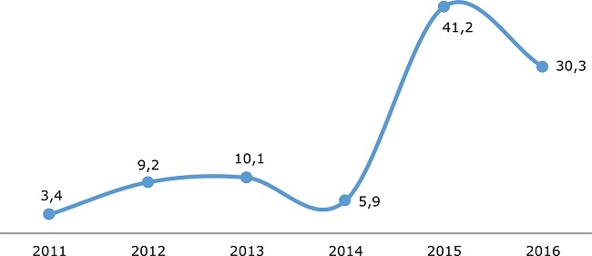 O pico dos protestos também antecede a queda da aprovação do governo, como mostra o Gráfico 6. O índice de aprovação do governo saltou de 48% em agosto de 2011, para 62% em agosto de 2012. Nesse mesmo período, os protestos cresceram 140%. Após a massificação dos protestos, em junho de 2013, o governo foi lançado na defensiva: em março de 2013, o índice dos que consideravam o governo ótimo/bom era de 65%, sua maior marca; no final de junho caiu para menos da metade, 30%, oscilando para 36% em abril de 2014. No contexto da campanha pelo impeachment, a aprovação do governo atinge suas piores marcas com 13% (2015) e 10% (2016)26.