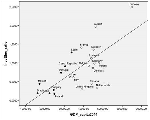 Table 2 also shows that parties in newer democracies are richer than those in more traditional democracies, when controlling for the national GDP. However, when controlling for the size of national electorates, parties in established democracies perform much better (last column). This indicates that the two factors must be evaluated together, through the GDP per capita. Figure 1 shows that this variable is a strong predictor of party income: the richer the country in relation to the size of its population, the wealthier its parties (r = 0.706, p < 0.01, adj. R2 = 0.473).