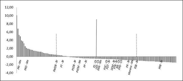 Finally, we evaluate the relative organizational strength using the Party Strength Index (PSI), which aggregates the z scores of M/E and party income/electorate ratios (Webb and Keith, 2017). Among the twenty parties in Latin America, eight have a PSI score higher than the median (-0.51), and only two parties are located in the last quartile of distribution (Figure 2 below). The PRI and PRD are the most powerful parties in Mexico, as well as the PMDB and PT in Brazil.