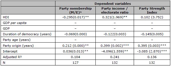 The results presented in the previous section corroborate some of the expectations derived from the literature. Regarding our first hypothesis, the tests of mean differences show that parties in established democracies are stronger than those of newer democracies, primarily because they are much richer. However, when controlling for the socioeconomic context (GDP or HDI) and the party-level variables (party origin), this relationship become less pronounced. This finding suggests that duration of democracy should not be the only factor to be considered when analyzing party strength and party institutionalization in a comparative perspective. The socioeconomic context matters (Tavits, 2013).