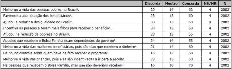 Por um lado, as pessoas concordam que a redução da pobreza é necessária. Por outro lado, discordam da atuação de um programa com transferência direta de recursos. Pesquisa de opinião pública nacional feita em 2008 mostrou que 72% dos brasileiros consideravam que o Programa Bolsa Família (PBF) trazia “mais boas coisas” para o Brasil, e 65% concordaram que ele “ajuda a combater a pobreza” no país. Existem outras diversas observações positivas (Castro et al., 2009). Mas a pesquisa também trouxe opiniões negativas: para 82%, o PBF “inclui pessoas que não precisam”; para 67%, “faz as pessoas se acomodarem e não quererem mais trabalhar” 7; e para 56%, “faz as pessoas quererem ter mais filhos”.