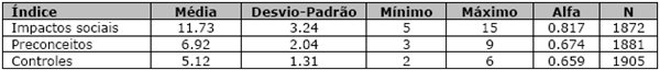 Foram criados três índices: de “impacto social” dos resultados percebidos do PBF; do nível de “preconceito” em relação aos beneficiários; e de crítica à suposta falta de “controle” do programa. O primeiro tem característica “positiva”: quanto maior o valor, mais alto o nível de concordância com visões positivas sobre os resultados. Os demais têm características “negativas”: quanto maiores os valores, mais altos os níveis de concordância com visões negativas sobre os beneficiários e o funcionamento do programa.