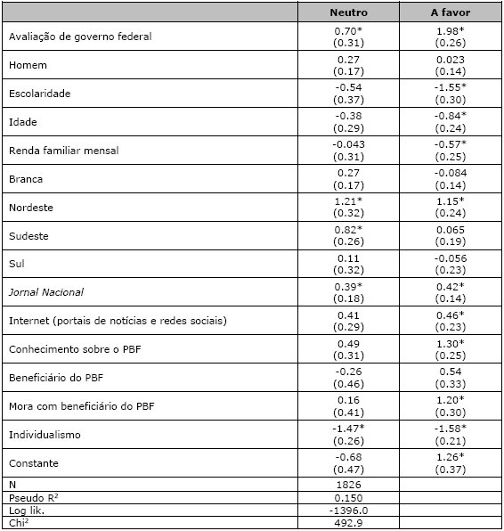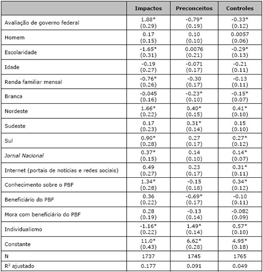 A avaliação do governo federal, ser morador do Nordeste e do Sul, a exposição ao Jornal Nacional e o conhecimento sobre o PBF apresentaram uma correlação positiva com a percepção dos impactos positivos do programa. A escolaridade, a renda familiar e o individualismo tiveram uma associação negativa. Esperávamos encontrar um posicionamento mais crítico dos habitantes da região Sul. De todo modo, e embora não tenhamos uma boa explicação para esse resultado, não o vemos como algo inverossímil, já que é possível ser crítico ao programa e, ainda assim, aceitar seus resultados positivos.