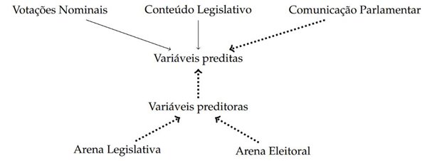 Descrição: A Figura 1 apresenta de forma esquemática a estrutura básica de análise da atividade parlamentar na ciência política. De baixo para cima, as arenas legislativa e eleitoral proveem variáveis preditoras com o objetivo de descrever as variáveis preditas que, de cima para baixo, são fruto de diferentes dimensões da atuação parlamentar, no caso: votações nominais, produção de conteúdo legislativo e comunicação parlamentar. Em destaque, através de flechas pontilhadas, encontra-se localizada a estrutura básica deste artigo.