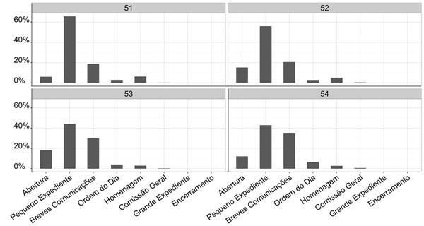 A grande maioria dos mais de 270 mil pronunciamentos foi realizada durante o Pequeno Expediente ( Figura 3 ), sendo ele o principal meio de comunicação da CD ao longo de todos os anos analisados, com exceção de 2013, terceiro ano da 54ª legislatura, quando apresentou uma pequena baixa em relação às Breves Comunicações 20 . Nos demais anos, a preponderância do Pequeno Expediente é nítida, conforme apresenta a Figura 4:
