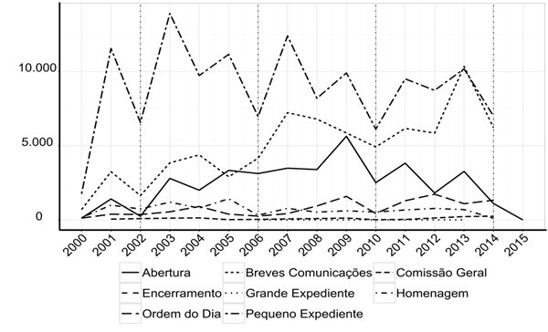 É justamente pelo fato de a fala parlamentar ter a possibilidade de se concretizar em ambiente de relativa independência em relação ao processo decisório que este artigo busca investigar como se distinguem os parlamentares em relação à sua frequência de discursos proferidos em plenário e avançar na análise de outras dimensões da atividade parlamentar. Para esses propósitos, portanto, as Breves Comunicações, as Comunicações Parlamentares, o Pequeno e o Grande Expedientes se caracterizam como momentos institucionais ideais para análise. A seguir, apresento as principais características desses momentos institucionais, justifico a escolha do Pequeno Expediente como foco deste artigo e analiso a fundo a frequência de uso desse momento institucional pelos deputados federais ao longo de 1999 a 2014.