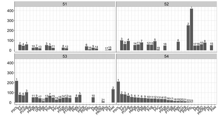 Descrição: Os valores acima das barras representam a posição de cada legenda partidária no ranking de