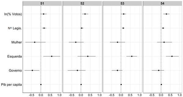 Quanto à legenda partidária, verifica-se que há um efeito positivo da classificação ideológica sobre a quantidade de discursos proferidos, com exceção da 52ª legislatura. O mesmo não pode ser concluído a respeito da participação da legenda partidária pela qual o deputado federal foi eleito na coalizão que compôs o governo ao longo da legislatura analisada. Somente na 51ª legislatura essa variável não apresenta efeito nulo. No caso, compor o governo apresenta efeito negativo sobre a quantidade de discursos realizada pelo parlamentar que foi eleito pela legenda.