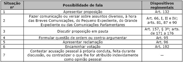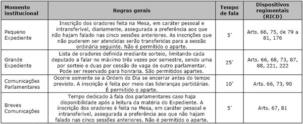 Em seu artigo 74, o Regimento Interno da Câmara dos Deputados (RICD) prevê sete possibilidades regimentais de fala para o parlamentar: (i) apresentar proposição; (ii) fazer comunicação ou versar sobre assuntos diversos, à hora do Expediente ou das Comunicações Parlamentares; (iii) tratar de proposição em discussão; (iv) levantar questão de ordem; (v) fazer reclamação; (vi) encaminhar a votação; e, a juízo do presidente da Casa, (vii) contestar acusação pessoal à própria conduta, feita durante a discussão, ou para contradizer o que lhe for indevidamente atribuído como opinião pessoal. Essa previsão de fala ocorre em oito momentos institucionais distintos: (i) Abertura; (ii) Breves Comunicações; (iii) Comissão Geral; (iv) Comunicações Parlamentares; (v) Grande Expediente; (vi) Homenagem; (vii) Ordem do Dia e (viii) Pequeno Expediente. Cada um desses momentos de fala possui regras próprias para a manifestação dos deputados federais ( Tabela 1 ), mas é no Pequeno Expediente, no Grande Expediente, nas Comunicações Parlamentares e nas Breves Comunicações que os parlamentares têm a previsão regimental para tratar de assuntos diversos à pauta e podem discursar de forma livre na tribuna desde que dentro do tempo e das regras permitidos: