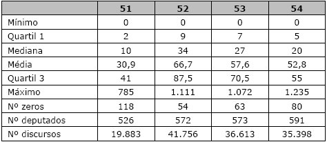 Fonte: Elaboração própria com base em dados da Câmara dos Deputados.Há, em média, 58,7 discursos proferidos no Pequeno Expediente por deputado federal que proferiu algum discurso 23 . No entanto, como verificamos na Figura 5 , enquanto alguns parlamentares discursaram apenas uma vez (97 ao todo), outros discursaram centenas de vezes e alguns poucos ultrapassaram a marca de mil discursos numa única legislatura. A Tabela 3 apresenta os dados descritivos da quantidade de discursos proferidos no Pequeno Expediente por deputado federal em cada legislatura: