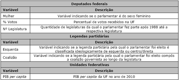 Uma vez que o objetivo deste artigo é ampliar o escopo de análise da atividade parlamentar na CD, convém resgatar as principais variáveis do debate desenvolvido ao longo de tantos anos em relação ao comportamento congressista. Por isso, são focos de análise aqui as seguintes variáveis: i) a classificação ideológica da legenda partidária pela qual o parlamentar foi eleito (esquerda ou centro/direita); ii) o posicionamento de sua legenda em relação ao governo (se o partido compôs ou não a coalizão governista ao longo da legislatura); iii) o percentual de votos recebidos pelo deputado federal na eleição que lhe conduziu à CD; iv) seu gênero; v) o número de legislaturas da qual fez parte em sua trajetória política após a Constituição Federal de 1988; vi) sua legenda partidária; vii) e a unidade federativa pela qual foi eleito.
