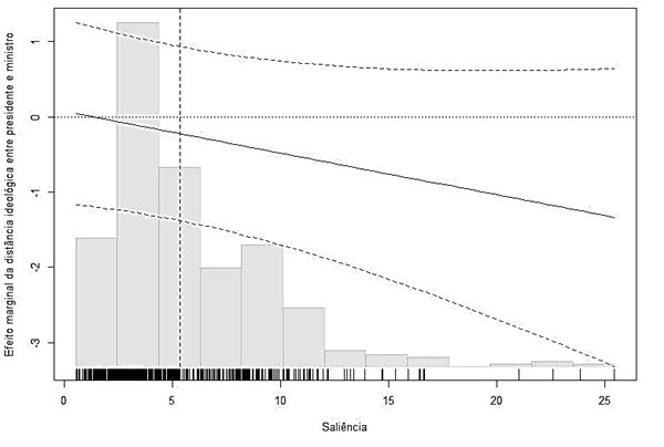 Interessante notar que, no modelo 5, com a inclusão do termo interativo, a variável saliência diminui o efeito da variável “distância ideológica presidente-ministro” na variável resposta, indicando que, tudo o mais constante, se um ministro é mais distante e ocupa uma pasta mais saliente para o presidente, sua estrutura tende a ser menos fortalecida. Isto é, ao incluir a distância, o efeito na variável resposta quando a saliência é alta diminui, conforme indica o Gráfico 1, com os efeitos marginais. Em suma, o modelo 4 indica que policy é importante no cálculo do presidente ao fortalecer a estrutura de um ministério, estando ele na mão de um ministro distante ou não. No entanto, o modelo 5 com o termo interativo demonstra que o presidente tende a ser mais cauteloso quando se trata de ministros mais distantes.