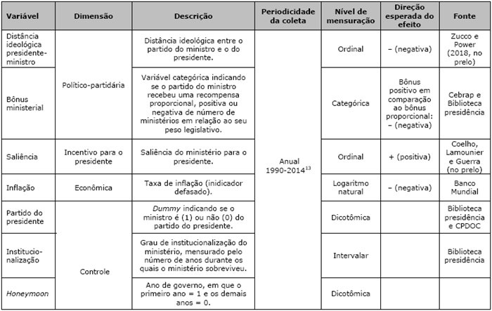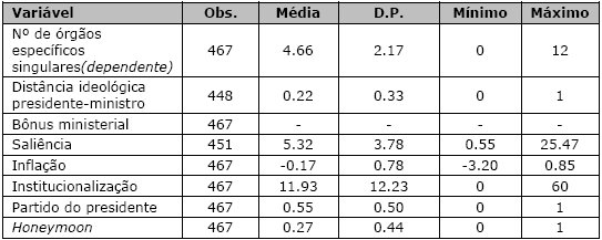 O Quadro 1 apresenta as variáveis independentes sumarizadas, mostrando a dimensão a que pertence, a descrição, a periodicidade da coleta, o nível de mensuração, a direção esperada do efeito e a fonte de coleta dos dados, enquanto a Tabela 1 apresenta as estatísticas descritivas de cada uma delas. O próximo passo da análise é testar as proposições emergentes desta seção. A expectativa é de que as dimensões aqui apresentadas estejam associadas à variação no número de órgãos dentro dos ministérios ao longo do tempo.