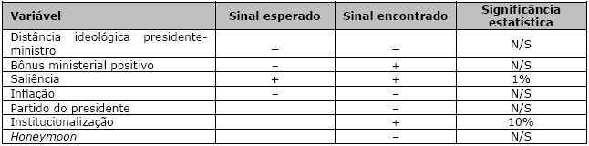 Mesmo que algumas variáveis não tenham apresentado significância estatística, seus resultados foram reportados acima, mas com certa limitação, pois não é possível rejeitar a hipótese nula de que os coeficientes encontrados sejam iguais a zero. Embora tal análise forneça apenas um retrato parcial de todas as mudanças que ocorrem na estrutura dos ministérios, este artigo buscou contribuir para o aumento do conhecimento sobre comportamento e estratégias presidenciais.