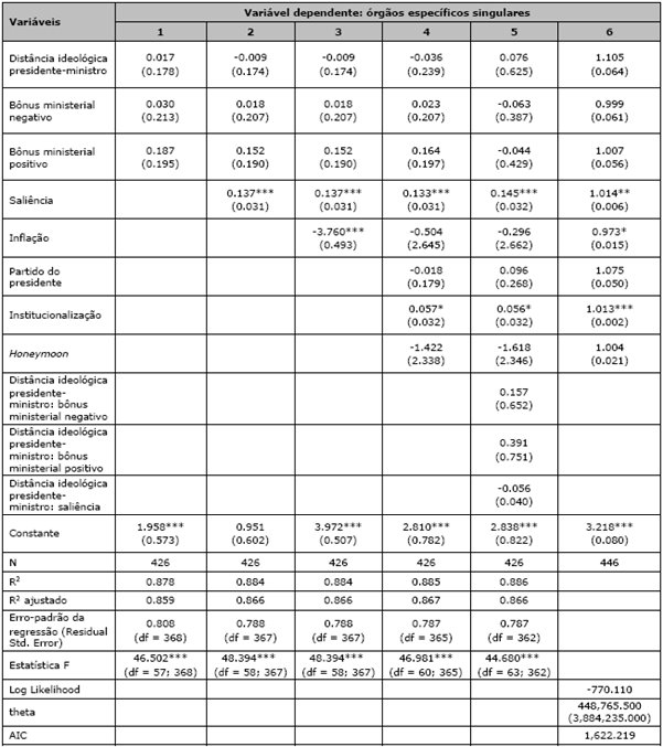 A Tabela 2 apresenta os resultados obtidos por meio dos modelos de regressão linear MQO com efeitos fixos por ministério e por ano, além de um modelo de contagem. Conforme é possível verificar, os modelos variam por dimensão. No primeiro modelo são incluídas as variáveis da dimensão político-partidária na tentativa de verificar seu efeito sobre o número de órgãos específicos singulares nos ministérios. No segundo modelo são incluídas as variáveis da dimensão relativa aos incentivos que o presidente tem para mudar a estrutura do ministério. No terceiro são incluídas as variáveis relativas à dimensão econômica e no quarto modelo (completo) são incluídas as variáveis de controle. No quinto, são testadas as interações entre algumas variáveis (distância ideológica presidente-ministro x bônus ministerial; distância ideológica presidente-ministro x saliência). O modelo com termos interativos visa verificar se o efeito que as variáveis exercem sobre o número de órgãos específicos singulares é condicional ao efeito de outras variáveis, no entanto, não se mostraram estatisticamente significantes. Por fim, o sexto modelo se refere ao modelo binomial negativo.