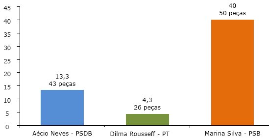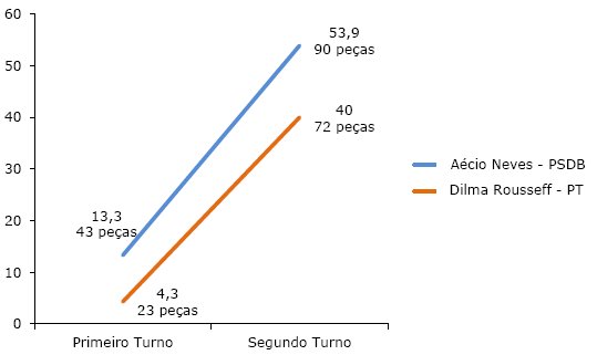 Em primeiro lugar, importa ressaltar que os programas em bloco mais fragmentados em peças eram os do PT: em média, 10 peças por programa; contabilizaram-se 610 peças no primeiro turno da campanha. Os programas do PSDB eram bem menos fragmentados do que os do PT: 4,4 peças em média por programa, somando-se 324 peças no primeiro turno. As peças do PSDB eram mais longas do que as do PT, o que atribuía à propaganda eleitoral desse último uma maior dinamicidade. Já os programas do PSB eram os menos fragmentados, apresentando uma média de 2,4 peças por programa, 125 peças no total, e isso é explicado pelo tempo significativamente mais curto de campanha do PSB com relação ao de seus adversários.