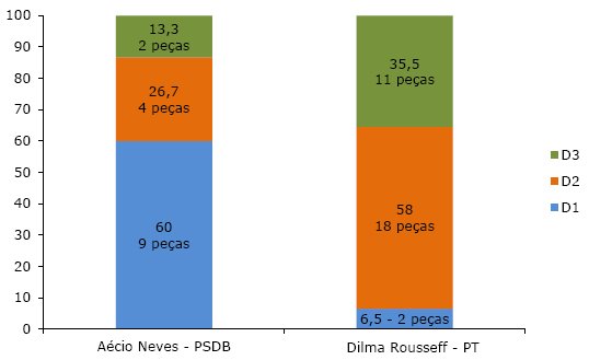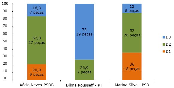 Legenda: D1 = desconstrução da imagem pessoal do adversário; D2 = desconstrução da imagem política do adversário; D3 = crítica ao projeto político defendido pelo adversário.