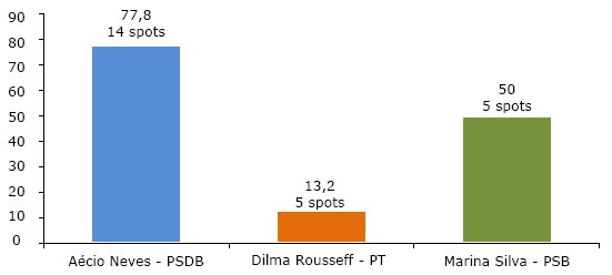 Os spots de campanha são inserções de até 30 segundos na programação normal das redes de TV aberta, assim como no rádio, que aqui não está sendo investigado. O objetivo é transmitir mensagens curtas, de modo ágil, visando atingir positiva ou negativamente o eleitorado com relação a determinada candidatura. Por serem curtos, contabiliza-se apenas uma peça por spot, descartando-se imagem de abertura e encerramento, em que não caberia a possibilidade de diálogo. Por ser uma linguagem mais objetiva do que o bloco, é possível supor que os spots sirvam de mecanismo propício para atingir candidaturas adversárias. Foram analisados 66 spots da campanha presidencial do primeiro turno de 2014: 18 do PSDB, 38 do PT e 10 do PSB.