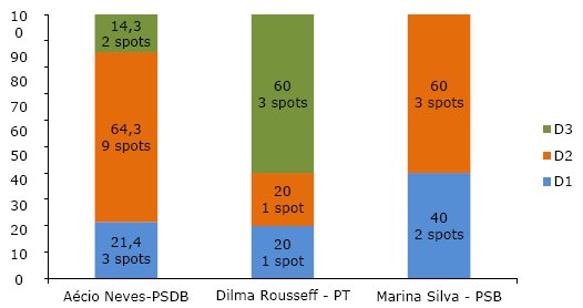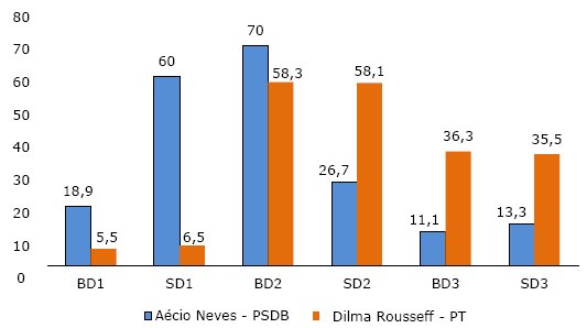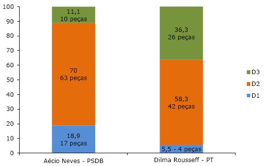 Fonte: Dados coletados na propaganda eleitoral televisiva de 2014 no acervo do Doxa-Iesp. Classificação própria.Aécio Neves investiu prioritariamente na desconstrução da imagem política do adversário (D2), assim como Marina Silva. Ambos buscavam apontar as fragilidades do governo federal sob o comando do PT. Fizeram isso em mais de 60% das vezes que tentaram dialogar. Dilma Rousseff também fez uso desse tipo de diálogo nos spots, embora em proporções significativamente menores: 20%. Seu principal alvo era o governo de Aécio Neves no estado de Minas Gerais. Novamente, sua principal estratégia dialógica foi a terceira, crítica às propostas de campanha do adversário, em contraste com as suas. O que chama atenção em seus spots, entretanto, é a ampliação da estratégia de primeiro tipo, a que mais se assemelha à propaganda negativa de cunho pessoal. Nesse caso, parece que nos spots a campanha do PT se sentiu mais à vontade em mencionar negativamente o caráter de seus adversários, desafiando-os. O PT atacou, proporcionalmente, tanto quanto a campanha do PSDB (20% e 21,4% respectivamente), sendo ambos deixados para trás pela virulência da campanha do PSB (40% do diálogo empreendido era dessa natureza), que sequer utilizou a terceira e mais democrática das estratégias dialógicas.