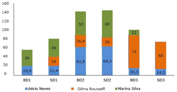 A eleição presidencial de 2014 foi particularmente competitiva, observando distintos cenários de resultados, sugeridos por pesquisas de intenção de voto, tanto no primeiro quanto no segundo turno. Na largada do primeiro turno, os candidatos favoritos a passar para o segundo turno eram Dilma Rousseff (PT) e Aécio Neves (PSDB). Entretanto, ao longo da campanha, as pesquisas de opinião sugeriam que, em um possível segundo turno entre a candidata à reeleição e um de seus adversários, Marina Silva (PSB) teria mais chances de vencer a eleição do que Aécio Neves (PSDB). A partir desse momento, a candidata do PSB passou a subir nas pesquisas, enquanto o candidato do PSDB declinava em proporções praticamente idênticas. Ao final da campanha, o cenário se inverteu novamente e Aécio Neves passou para o segundo turno juntamente com Dilma Rousseff, que manteve relativa estabilidade em sua intenção de voto ao longo do primeiro turno. Apoiado pela adversária derrotada do PSB, o candidato do PSDB permaneceu em vantagem com relação à adversária do PT durante quase toda a campanha de segundo turno, cenário revertido na reta final, resultando na reeleição de Dilma Rousseff.