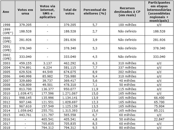 Apesar de a CP ter sido proposta pelo núcleo do governo Britto, sem a participação direta dos Coredes em sua concepção, tais conselhos aceitaram assumir as atribuições de coordenação da Consulta, conforme estipulado na lei de criação da CP. A primeira edição da CP mobilizou expressivos 379.205 eleitores, que escolheram prioridades de políticas públicas a partir das alternativas disponíveis em uma lista elaborada pelos Coredes. Diferentemente do OP de Porto Alegre (criado por um governo de esquerda chefiado pelo PT) – que era focado nas assembleias locais, na participação face a face e na inclusão de grupos social e politicamente marginalizados –, o modelo da CP criado pelo PMDB enfatizou a votação universal em uma tentativa de incluir um maior número de participantes, em uma escala supralocal, e de buscar maior eficiência no uso de recursos públicos. Um exemplo disso é que o governo estadual optou por não contar o número de participantes nas etapas em que se daria a participação face a face. A Tabela 1 apresenta os dados consolidados da CP entre 1998 e 2018: