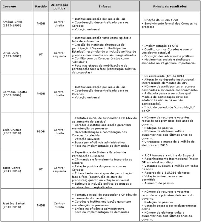 É argumento corrente que as instituições participativas são vulneráveis a mudanças de governo e mantêm-se, muitas vezes, ligadas ao partido político ou ao gestor que as criou. Com uma trajetória de mais de 20 anos e tendo sobrevivido a seis mudanças de governo, cada qual com sua própria ideologia, a CP é incomumente resiliente. O tema conseguiu atingir um status suprapartidário ( Goldfrank e Schneider, 2006 ; Faria, 2006 ; Cortes, 2003 ). As disputas em torno da questão conseguiram ir além do binômio de ter ou não ter mecanismos de participação direta da população no orçamento, para concentrar-se na disputa sobre qual o modelo participativo mais adequado para o RS.