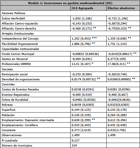 Los resultados de los modelos de regresión muestran que un 1% de aumento de personal para GMRRD está asociado a un incremento en la inversión en protección medioambiental, entre 13,51 y 17,86 ul (significancia al p < 0.05 - p < 0.10), y un aumento en la inversión en mitigación en 6,174 ul (significancia al p < 0.10). Un aumento de un 1% del Fondo Común Municipal en el ingreso del municipio genera un decrecimiento de las inversiones en protección medioambiental y mitigación; en el caso de las primeras, en 0,0142 ul (significancia al p < 0.05), y las segundas disminuyen entre 0,0690 y 0,00701 ul (significancia al p < 0.05).