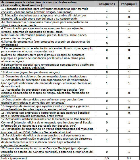 En suma, Panguipulli destacó por la tematización de los asuntos medioambientales y de riesgos en el Concejo Municipal, la legislación de ordenanzas, por sus iniciativas de inversión, presupuestos, acciones e intervenciones en la GMRRD. Cauquenes, en cambio, representa una gran cantidad de municipios chilenos que no priorizan GMRRD.