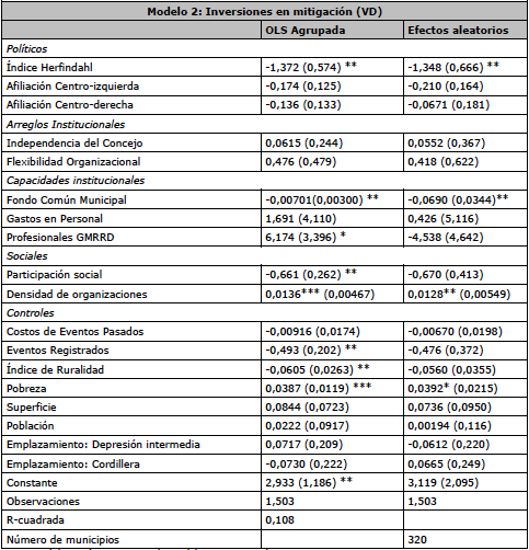 Observando en una muestra mayor de municipios, los resultados del análisis cuantitativo son consistentes con los hallazgos del análisis cualitativo sobre efectos de los factores políticos en GMRRD. Las variables "Concentración de Votos del Alcalde" y la “Ideología” (centro-derecha) tienen efectos negativos en las inversiones en GMRRD. En el modelo 2 (Cuadro 2), el índice de concentración de votos del alcalde tiene coeficientes negativos de 1,372 y 1,348 (significancia al p < 0.05). Una unidad de aumento en el índice de concentración de votos del alcalde induce un decrecimiento en las inversiones municipales en mitigación entre 1,372 y 1,348 unidades logarítmicas (ul). En el modelo 1 (Cuadro 2), la ideología del alcalde de centro-derecha tiene coeficientes negativos de 0,560 y 0,755 (significancia al p < 0.05). Cuando el alcalde es de centro-derecha disminuyen las inversiones en protección medioambiental entre 0,560 y 0,560 ul. En Chile, la ideología de centro-derecha promueve los mercados y el crecimiento económico, mientras que la de centro-izquierda el estado de bienestar y el gasto público.