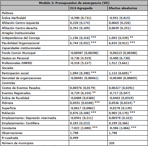 El análisis consideró las siguientes variables dependientes: (1) Costos de proyectos en gestión medioambiental; (2) Costos de proyectos en mitigación; (3) Fondos presupuestarios de emergencia. Los proyectos de gestión medioambiental son iniciativas para mejorar las condiciones medioambientales de la comuna y reducir riesgos, por ejemplo, energías renovables o protección de bosques. Las iniciativas de mitigación deben reducir o revertir daños medioambientales que exponen a riesgos, tales como intervenciones humanas que causan contaminación. Con la orientación de diversas tipologías consultadas en la literatura (IPCC, 2012), procedimos a seleccionar información sobre los costos de los proyectos de gestión medioambiental y mitigación ingresados a la base integrada de proyectos de inversión del Ministerio de Desarrollo Social para los años 2009, 2010, 2011, 2012, 2013 y 2014. Los fondos de emergencia representan las capacidades de los municipios para prepararse y enfrentar problemas causados por eventos extremos en la comuna y responder cuando se desencadenan los eventos y en la fase de recuperación. Las fuentes primarias consultadas fueron los presupuestos municipales anuales destinados a fondos de emergencia para los años 2009-2014. La variable fue calculada como el porcentaje de esos fondos de emergencia en el presupuesto anual del municipio.