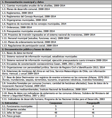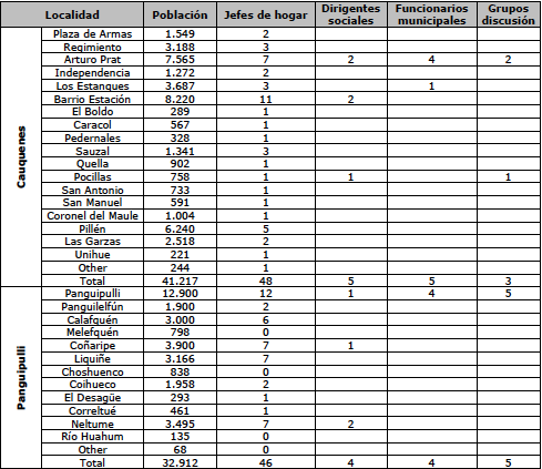 La información fue recopilada entre los años 2013 y 2016. Primero, trabajo con la literatura disponible, búsqueda de documentación, aplicación de entrevistas a funcionarios municipales, jefes de hogar y dirigentes sociales (Cuadro A2 del Apéndice). Segundo, aplicación de encuestas a muestras representativas de jefes de hogar en las dos comunas (casos: Cauquenes 200; Panguipulli 210), y la revisión de registros y fuentes oficiales (2009-2014).