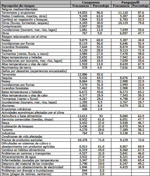 Los entrevistados y una parte de los jefes de hogar encuestados en Cauquenes y Panguipulli relacionaron el concepto riesgo medioambiental con experiencias, efectos en sus condiciones de vida, y su preocupación por la posibilidad de desastres (Cuadro A3 en Apéndice). Los registros disponibles indican que esas comunas están expuestas a riesgos medioambientales, enfrentan periódicamente situaciones de emergencia por sequías e incendios forestales, inundaciones, nevazones y heladas (Cuadro A4 en Apéndice). La sobreexplotación de recursos naturales y la contaminación han dañado el medio ambiente (suelos erosionados, aguas, aire, pérdida de biodiversidad), aumentando la exposición y el riesgo (Valdivieso y Andersson, 2017).