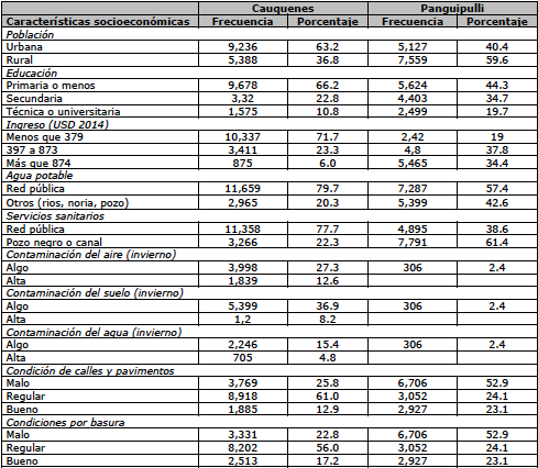 Un significativo porcentaje de la población es vulnerable frente a los riesgos medioambientales por sus condiciones habitacionales, deficiente infraestructura sanitaria, el aislamiento, el desempleo crónico, bajos ingresos y la pobreza (Cuadro A5 en Apéndice). En las zonas urbanas, una parte de los jefes de hogar relacionó el mal estado de las viviendas y de la infraestructura vial con el concepto de exposición, y en las zonas rurales las dificultades de acceso a recursos hídricos, la falta de servicios sanitarios, el deficiente estado de los caminos, la inestabilidad laboral, carencia de servicios de salud y el aislamiento.