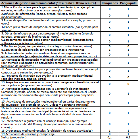 Al ser consultados por 19 actividades deseables de protección medioambiental, el funcionario responsable de medioambiente en Panguipulli informó que el municipio realiza 16 (84%), mientras que funcionario encargado de Medioambiente de Cauquenes informó sobre 2 (10%) (Cuadro A5). Consultados los funcionarios de medioambiente por 20 actividades y acciones de prevención y reducción de riesgos, el de Panguipulli informó 14 actividades (70%), el de Cauquenes sólo 9 (45%) (Cuadro A6).