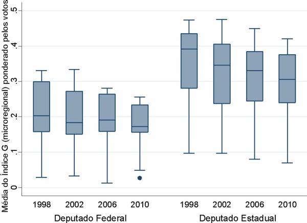 No Gráfico 1, o índice G foi calculado para o nível microrregional, em linha com o encontrado em Avelino, Biderman e Silva (2016). É possível notar que todas as médias, nas quatro eleições, são menores para os candidatos a deputado federal12. Já os valores para o cargo de deputado estadual, por apresentarem maior magnitude, são maiores do que os de deputado federal. Isso está de acordo com o esperado: quanto menos cadeiras em disputa, menos concentrados são os votos. É importante destacar que o resultado está relacionado ao número de votos recebido pelo candidato. Ao avaliar as médias do índice G ponderadas pelo número de votos de cada candidato em cada um dos distritos, nota-se a manutenção do mesmo padrão. A Tabela 3 mostra os valores médios ponderados para cada distrito: