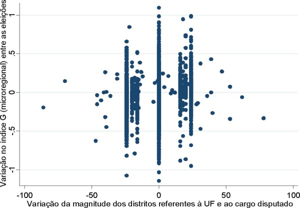Deve-se ressaltar que os modelos apresentados acima possuem uma medida de ajuste muito baixa – o R2 oscila em torno de 2,9% a 4,7%. Apesar disso, é preciso ter em vista que o artigo não se propõe a determinar fatores explicativos para os níveis de concentração de votos dos candidatos, mas, sim, identificar se há relação entre magnitude e concentração regional de votos. Esse é um problema teórico posto pela literatura, mas que ainda não havia sido explorado devidamente. O Gráfico 2 mostra, inclusive, a baixa correlação existente entre a variação da magnitude dos distritos pelos quais os candidatos concorreram e a variação de seus indicadores de concentração regional de votos. Novamente, essa situação não é problemática diante da relação teórica estabelecida para a avaliação do caso brasileiro.