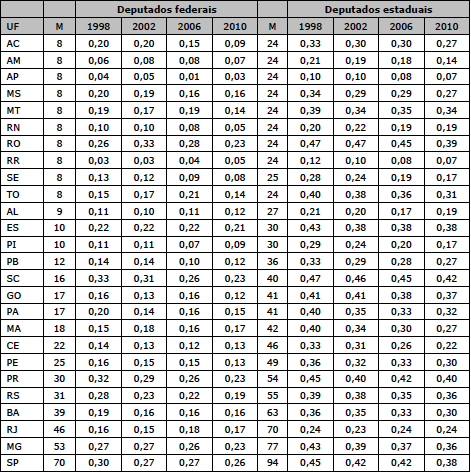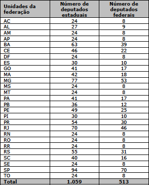 Entretanto, o caso brasileiro é particularmente interessante para a avaliação empírica dos efeitos das regras eleitorais. Apesar de as disputas para os cargos legislativos estaduais e federal se darem sobre as mesmas regras – são escolhidos pela população em eleições proporcionais que ocorrem em distritos que são os estados da federação através de listas abertas –, há uma grande diferença quanto ao número de cadeiras em disputa: o número de deputados estaduais a serem eleitos é bastante superior ao número de deputados federais3. A Tabela 1 mostra esses números por estado4: