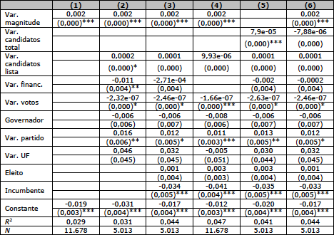 Embora em linha com as expectativas teóricas, essas observações não são suficientes para concluirmos o efeito da magnitude dos distritos sobre os níveis de concentração dos candidatos. Isso porque os procedimentos descritivos feitos acima implicitamente assumem que os candidatos em diferentes distritos são comparáveis entre si. Um candidato a deputado federal eleito pelo Rio Grande do Sul seria comparável com um outro candidato a deputado federal não eleito por Goiás. A disputa em um ou em outro estado estaria condicionada às mesmas forças. Essa suposição é bastante forte, não só pela estruturação dos sistemas partidários locais como também pelas características individuais daqueles que decidem candidatar-se em cada uma dessas localidades. Assim, essas dificuldades devem ser contornadas.