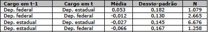 Resta ainda uma avaliação a ser realizada: a comparação das variações dos índices G entre os candidatos aos diferentes cargos como apresentado na equação (7). O primeiro passo a ser feito, mais descritivo, é comparar diretamente as médias para cada uma das quatro variações possíveis entre as eleições. A Tabela 5 apresenta estes resultados: