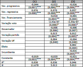 Mas, como dito, não há controles nesse modelo e, assim, é preciso incluí-los. Para isso, volta-se ao mesmo modelo de regressão trazido anteriormente e nele é incluída a variação de cargo. São criadas duas variáveis para isso: uma é a dummy para a variação progressiva na carreira, caso dos candidatos que concorrem inicialmente para o cargo de deputado estadual e depois deputado federal; a outra é uma dummy para a variação regressiva na carreira, quando o candidato concorre primeiro para deputado federal e depois para deputado estadual. A Tabela 6 apresenta os resultados obtidos: