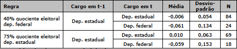 Apesar de interessante, esse procedimento gera problemas com o número de observações: apenas 108 candidatos a deputado estadual que se recandidataram na eleição seguinte obtiveram ao menos 40% dos votos equivalentes ao quociente eleitoral da disputa para deputado federal, e apenas 40 obtiveram 50% desse montante. Outro critério menos restritivo seria considerar o percentual do quociente eleitoral da disputa para deputado estadual. Nesse caso, os candidatos que se aproximassem de determinado patamar teriam conseguido se eleger praticamente apenas com seus votos ou estariam próximos a isso, o que seria um indicativo de sua competitividade. Considerando esse critério, 40 deputados estaduais que se recandidatam conseguiram alcançar o limite de 90% do quociente eleitoral, enquanto outros 96 alcançaram 75% desse quociente. Assim, a fim de utilizar uma abordagem que possua número de observações razoável, dois limites – 40% do quociente eleitoral para a disputa entre deputados federais e 75% do quociente eleitoral para a disputa entre deputados estaduais – serão trabalhados com intuito de testar a robustez dos resultados mostrados anteriormente. A Tabela 7 apresenta a primeira comparação: