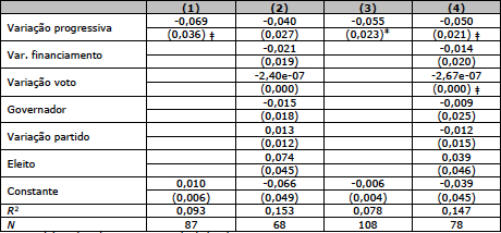 Na Tabela 8, os dois primeiros modelos se referem à regra de comparação com os 40% do quociente eleitoral na disputa para deputado federal e os modelos (3) e (4) se referem à regra de comparação com os 75% do quociente eleitoral na disputa para deputado estadual. Os dados dessa subamostra referem-se apenas a candidatos que ou se mantiveram na disputa pelo mesmo cargo ou perseguiram progressão em sua carreira. Por isso, foi utilizada agora apenas a variável de variação progressiva. É interessante notar que, ainda que os sinais observados da variação de cargo se mantenham, a significância diminui se comparada com os dados da Tabela 617. Porém, o valor do coeficiente apresentado nos modelos das colunas (1) e (3), respectivamente, da Tabela 6 não são estatisticamente diferentes dos valores observados na Tabela 8, considerando os mesmos controles. Interessante, aliás, é notar que agora o parâmetro para a constante não é estatisticamente diferente de zero. Aqui, assim como na Tabela 6, os candidatos que permanecem na disputa pelo mesmo cargo apresentam votação com o mesmo nível de dispersão entre as eleições, confirmando o esperado na equação (7). Os novos dados confirmam as expectativas teóricas, já que para os candidatos a deputado estadual que permanecem nessa disputa, o padrão de dispersão de seus votos se mantém entre as eleições. Tal resultado está em contraposição ao anterior que indicava a dispersão dos votos entre as eleições para candidatos com ambição estática e sugere que o efeito de dispersão é mais forte para os indivíduos que na eleição em t-1 obtiveram votações menores que os thresholds considerados aqui. Esses achados merecem futura avaliação.
