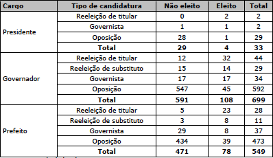 A Tabela 1 apresenta a distribuição dos 1.281 candidatos que disputaram as eleições majoritárias nacionais, para presidente ou governador, em 2002, 2006, 2010 e 2014, e para as prefeituras das 26 capitas de estado nas eleições de 2004, 2008 e 20126, segundo as categorias propostas. Do total de candidatos analisados, há 74 candidatos à reeleição do tipo “titular”, 40 candidatos à reeleição “substitutos”, 73 “governistas” e 1.094 “oposicionistas”. As evidências iniciais sugerem que faz sentido a tipologia que propomos ao mostrarem a existência de uma hierarquia de forças entre eles. A taxa de sucesso eleitoral dos candidatos à reeleição “titulares” é de 77%. Ela cai para 55% entre os candidatos à reeleição “substitutos”, recua para 36% entre os governistas e atinge 8% entre os oposicionistas.