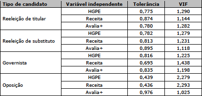 O interessante é que, apesar da indicação de inexistência de colinearidade, percebe-se que, no caso dos candidatos de oposição, os valores ficam mais próximos dos limites (exceto para avaliação positiva do governo em disputa), sendo mais baixos no caso do índice de tolerância e mais altos no VIF do que nos demais tipos de concorrentes. Isso mostra que, para os candidatos de oposição, as variáveis “percentual de tempo de HGPE” e “percentual da receita em reais” tendem a ser mais colineares do que “percentual de avaliação bom e ótimo da administração em disputa”12.